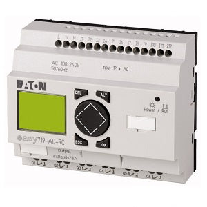 easy700, alimentación 100-240vac, 12di, 6do tipo relé 10a, pantalla y teclado, reloj tiempo real